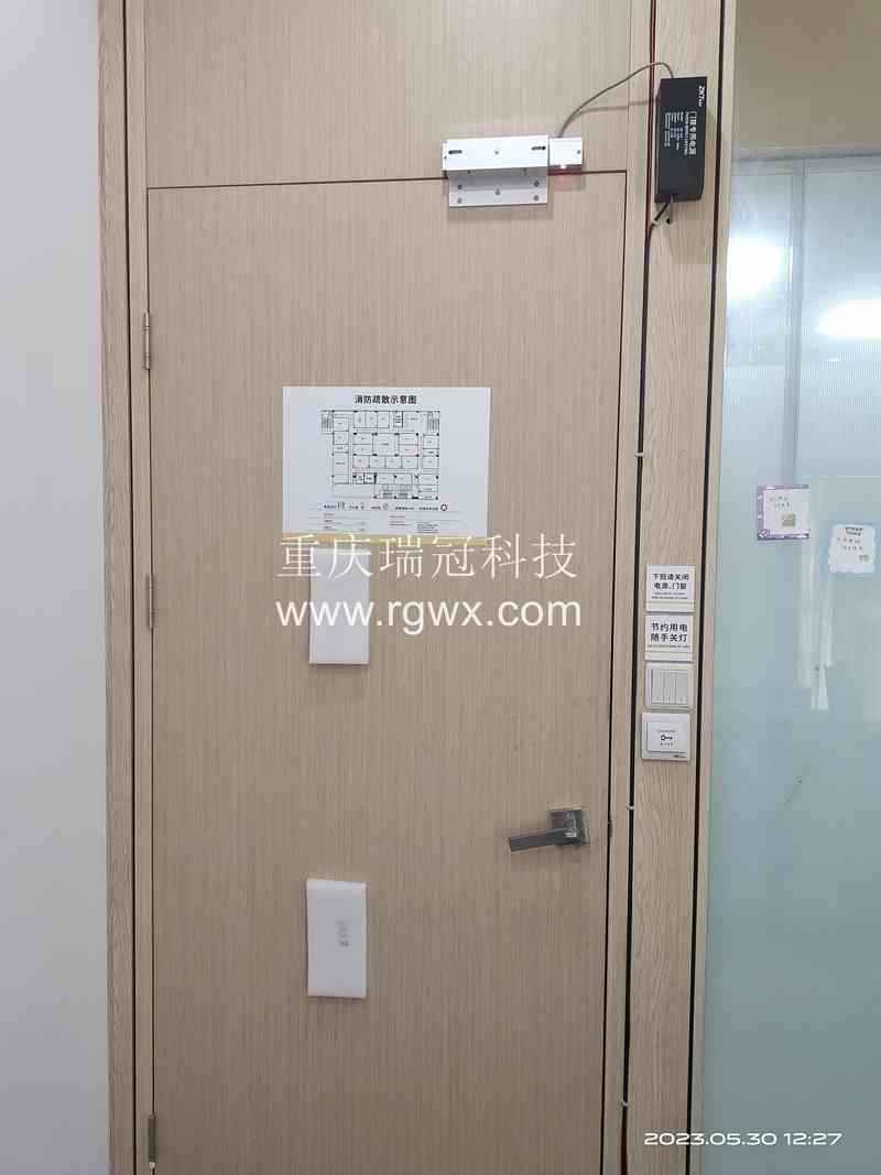 重慶市江北區(qū)石馬河街道(冉家壩,南橋寺,大石壩,人和,大竹林,龍湖源著天街旁邊)兩江春城璽苑寫字樓4號樓上一培訓(xùn)機(jī)構(gòu)門禁安裝??蛻糸T為單門木門,門框?yàn)槟究?,要求安裝一套單門門禁磁力鎖,外面刷卡,指紋,密碼開鎖,里面安裝出門按鈕。此門位置特殊,需要安裝Z型支持才能正常安裝。此處上方無其它隔板,于是門禁電源安裝于門框上方。線路大部分可隱藏安裝,便于美觀。